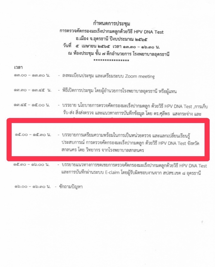 แนะแนวเรื่อง 30 มีนาคม 2565 เวลา 13.00-16.00 น. ประชุมผลการดำเนินงาน HPV DNA Test 2 ไตรมาส 22 เมษายน 2565 เวลา 08.00-14.00 น. สัมมนาวิชาการเรื่อง ผลการดำเนินการการให้บริการตรวจคัดกรองมะเร็งปากมดลูกด้วยวิธี HPV DNA Test ของหน่วยตรวจโรงพยาบาลศูนย์สกลนคร